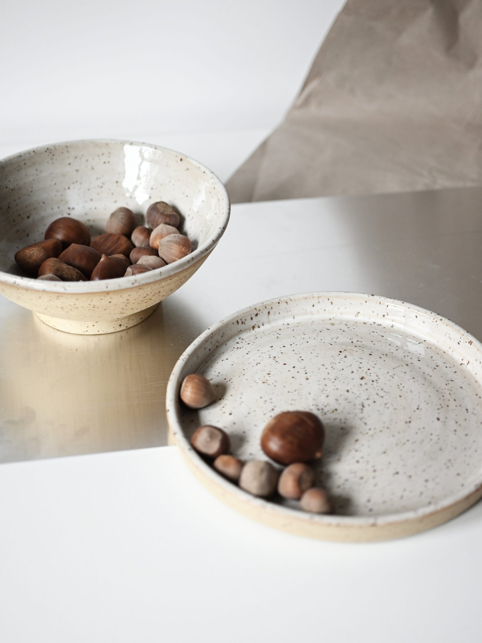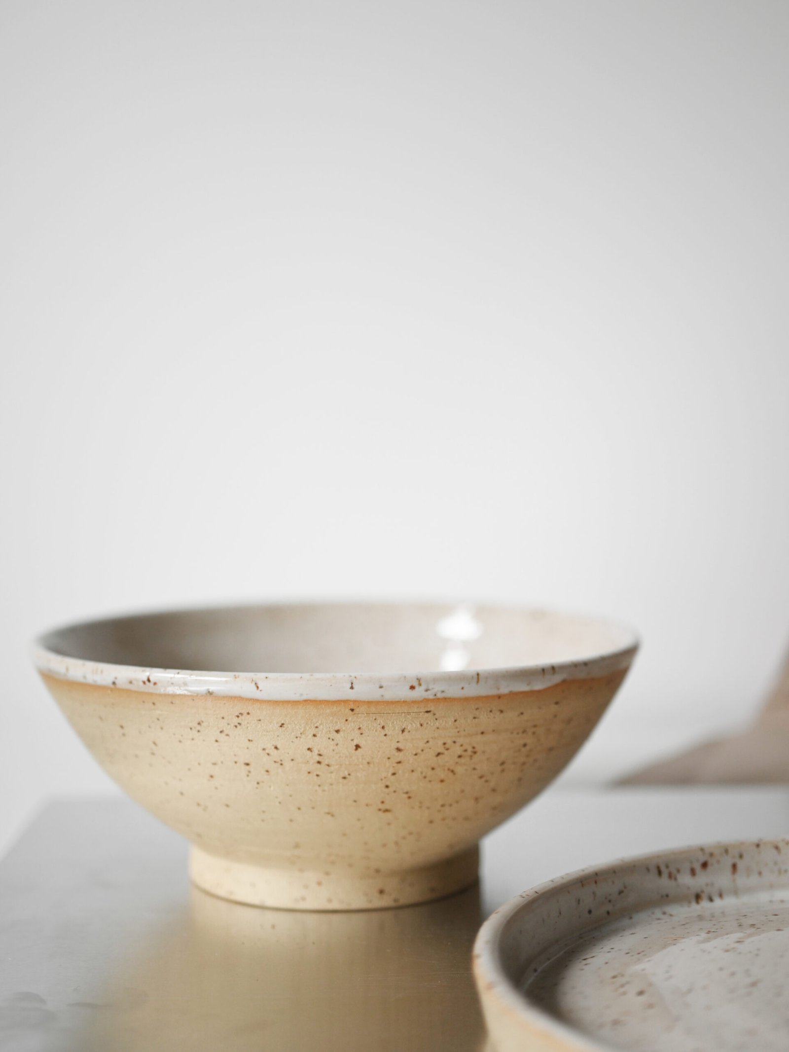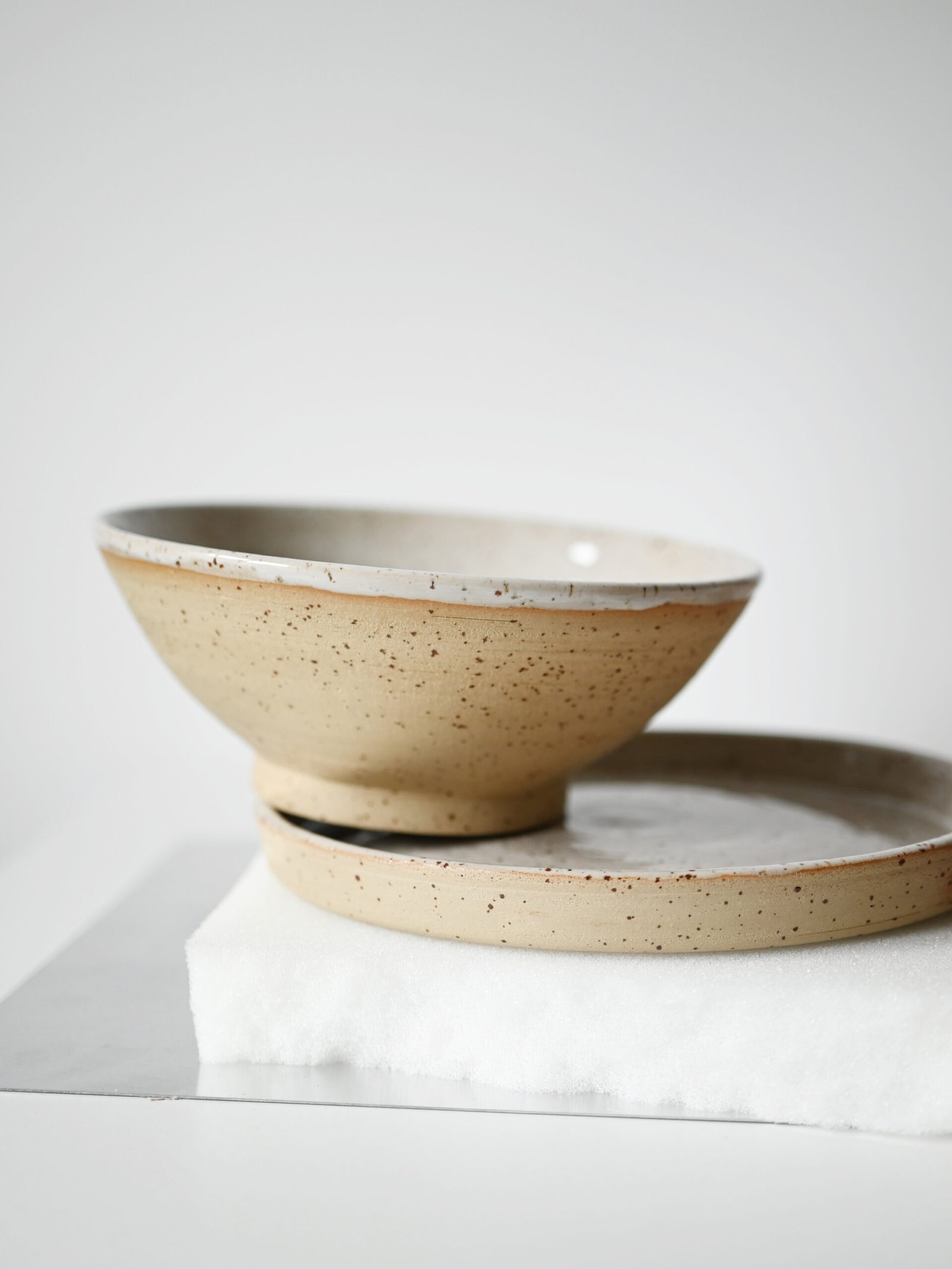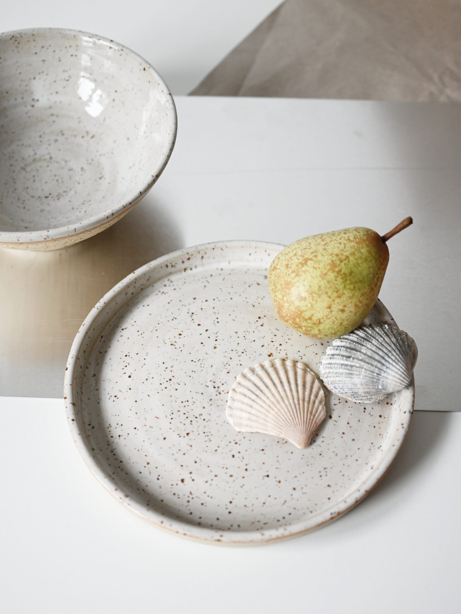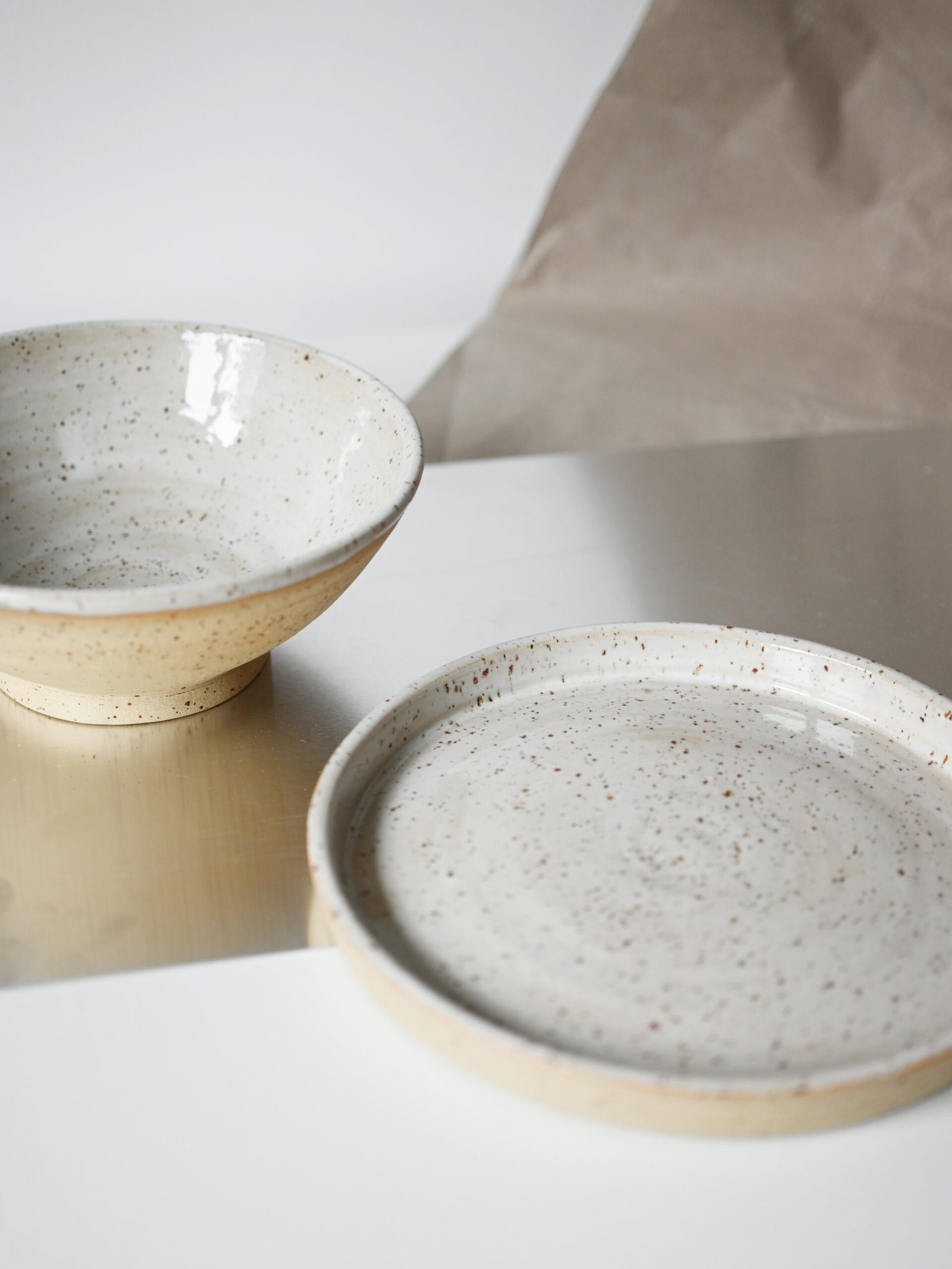 Wykonany z jasnej kamionki z piegami.